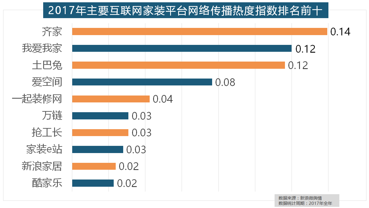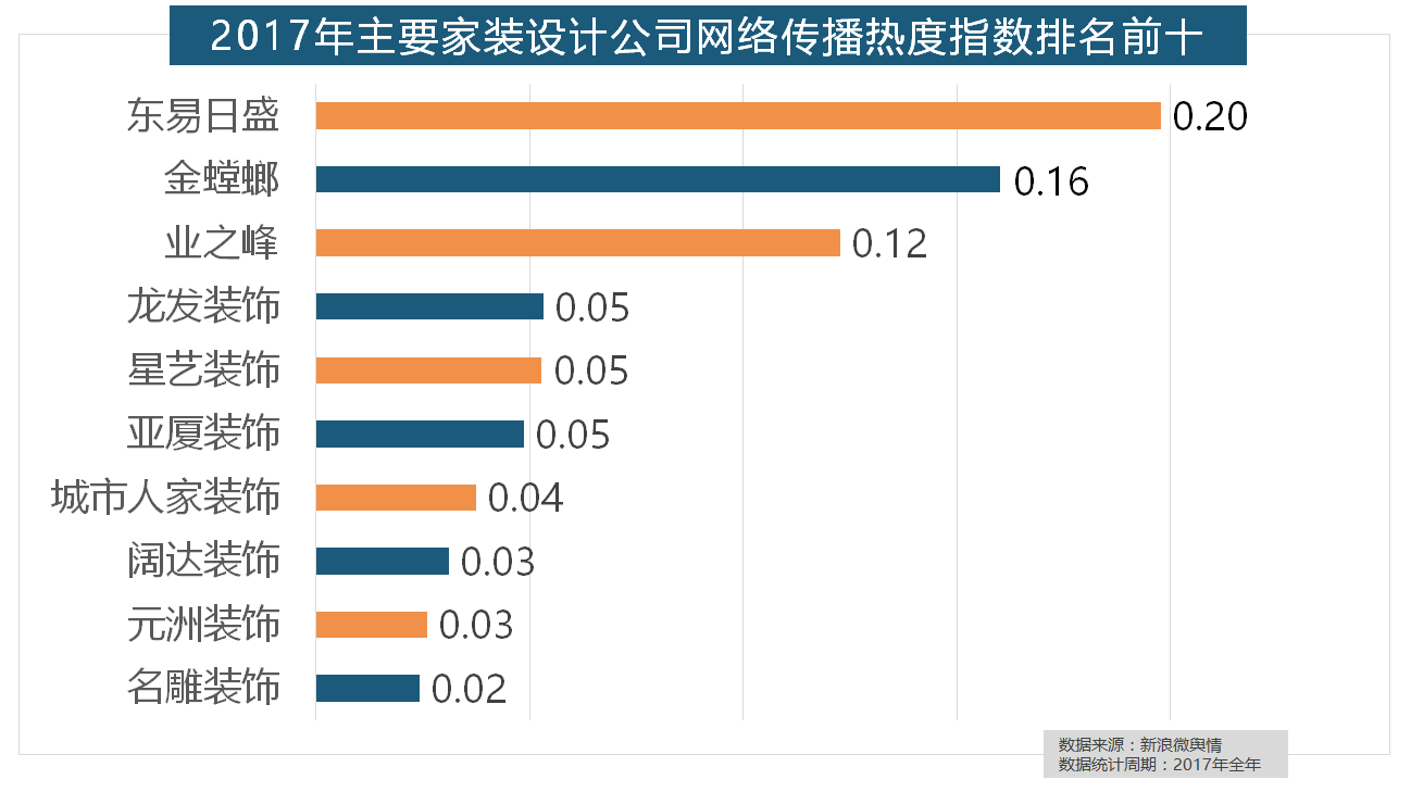 除各保守家拆设想企业逐鹿我国度拆市场外,2017年,东易日盛正在过去的一年中收集热度指数最高,大天然木门、春天木门、欧派木门、TATA木门、索菲亚的收集热度指数排名前五,立邦、三棵树、多乐士的收集热度指数最高,全年收集热度指数较着高于欧式气概和中式气概。据新浪微舆情大数据阐发显示,2017年,虽然近年来浩繁互联网家拆平台纷纷兴起,此外,2017年!西门子、施耐德、ABB、欧姆龙、松下全年收集热度指数位列前五位。收集热度指数遍及低于保守家拆设想龙头企业。进口品牌全面占领了年度开关、插座类品牌热度榜,2017年,2017年家拆行业热度不减,随后为卫浴类和地板类产物。“拆修”的收集热度指数为29.89,恒洁卫浴、乐家卫浴、美标卫浴、安华卫浴、法恩莎卫浴位列六至十位。